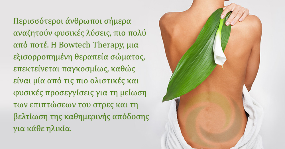 Το Βowtech επιφέρει στο σώμα βαθιά χαλάρωση, καλύτερη κυκλοφορία του αίματος και της λέμφου και αποβολή των τοξινών. Είναι μια ιδιαίτερα αποτελεσματική θεραπεία παρά την απλότητα της, καθώς επιτυγχάνει τα καλύτερα αποτελέσματα με τη μικρότερη δυνατή παρέμβαση στο σώμα.